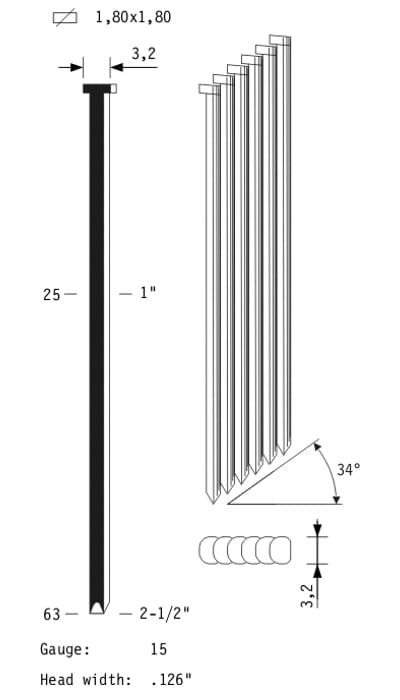 STANLEY BOSTITCH Sztyfty/gwoździe galwanizowane z łebkiem o średnicy trzpienia 1.8mmx1.8mm, długość 64mm, główka "D"- 3,2mm, kąt 34'. Do sztyfciarek / gwoździarek pneumatycznych i akumulatorowych.